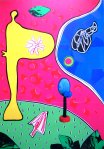 These works are intensely private. They seem to exist on two levels; Evelyn Bennett has recently given birth to their first child, Alf. The collages use colours and a visual language that evoke pregnancy, birth and childhood. They also suggest a unity; a dialogue is going on between two or sometimes three forms. It conjures therefore the close bonds of family life. Christopher Rutter writes, “much of our work derives from a kind of underground daydreaming of anxieties, joys, terrors and real experiences; of our childhood lives, parenting, conception, birth, gender and sexuality, the dynamics of our relationship.” The subject matter is therefore more complex than the process of becoming a parent; it reaches into the ‘dynamics’ of their relationship as it has evolved while they have known one another.